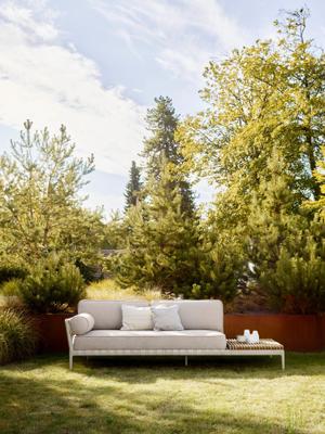 Der Komfort des Wohnzimmers wird mit dem Outdoor-Sofa von Vipp auf die Terrasse gebracht. Das 3-Sitzer-Sofa besteht aus schnell trocknenden Kissen und einem speziell für den Außenbereich entwickelten Stoff, der eine lange Lebensdauer unter allen Außenbedingungen gewährleistet. Ein speziell entwickeltes System von Gurten ist unter den Sitzpolstern angebracht, um den Komfort zu erhöhen. Die Gurte sind sichtbar, um das rhythmische Muster der Rücken- und Armlehne wiederzugeben. Die Rückenkissen und das Nackenkissen bestehen aus einer Mischung aus Fasern und Outdoor-Schaumstoff, der schnell trocknet.