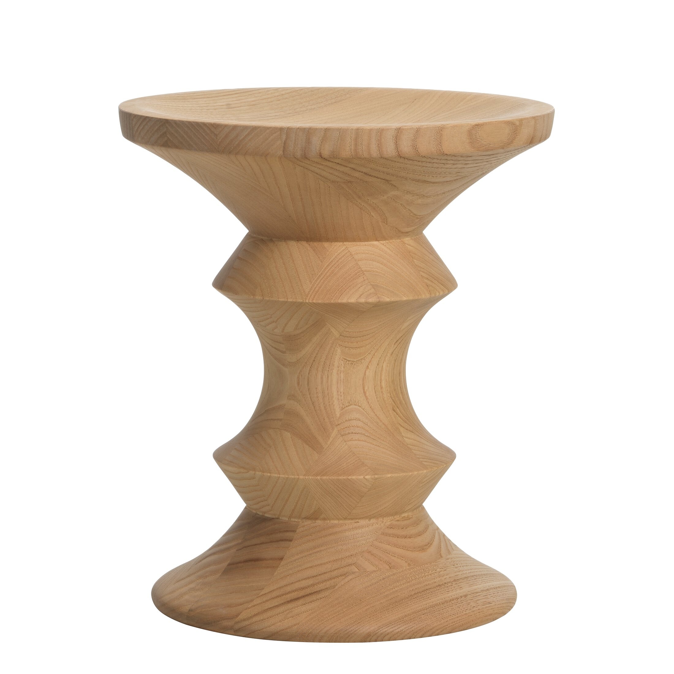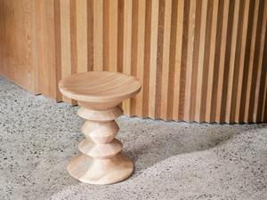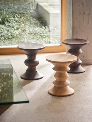 Vitra fertigt die Stools aus europäischem Massivholz. Neben der Variante in dunklem Nussbaum steht eine helle Ausführung in Kastanienholz zur Wahl. Beide Hölzer zeigen eine feine Maserung und eine warme, natürliche Farbigkeit. Die Oberfläche wird mit Hartwachsöl behandelt. Durch das matte Finish wirkt das Holz weicher und zurückhaltender, die Tiefe des Materials tritt stärker hervor.