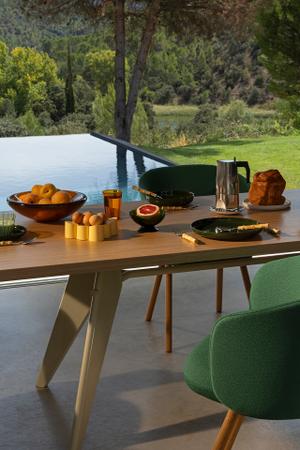 Die abnehmbaren Bezüge des Mikado Stuhls von Vitra ermöglichen eine einfache Reinigung und den Austausch. Die Beine können individuell ersetzt werden und bieten die Option für verschiedene Materialien wie Holz oder recyceltes Aluminium. Die Sitzplatte besteht aus Aluminium mit einem hohen Anteil an recyceltem Material, während die Rückenlehne aus leicht recycelbarem Post-Consumer-Polypropylen gefertigt ist. Das innovative Konzept des modularen Austauschs macht Mikado besonders anpassungsfähig und langlebig für langfristige Nutzung.