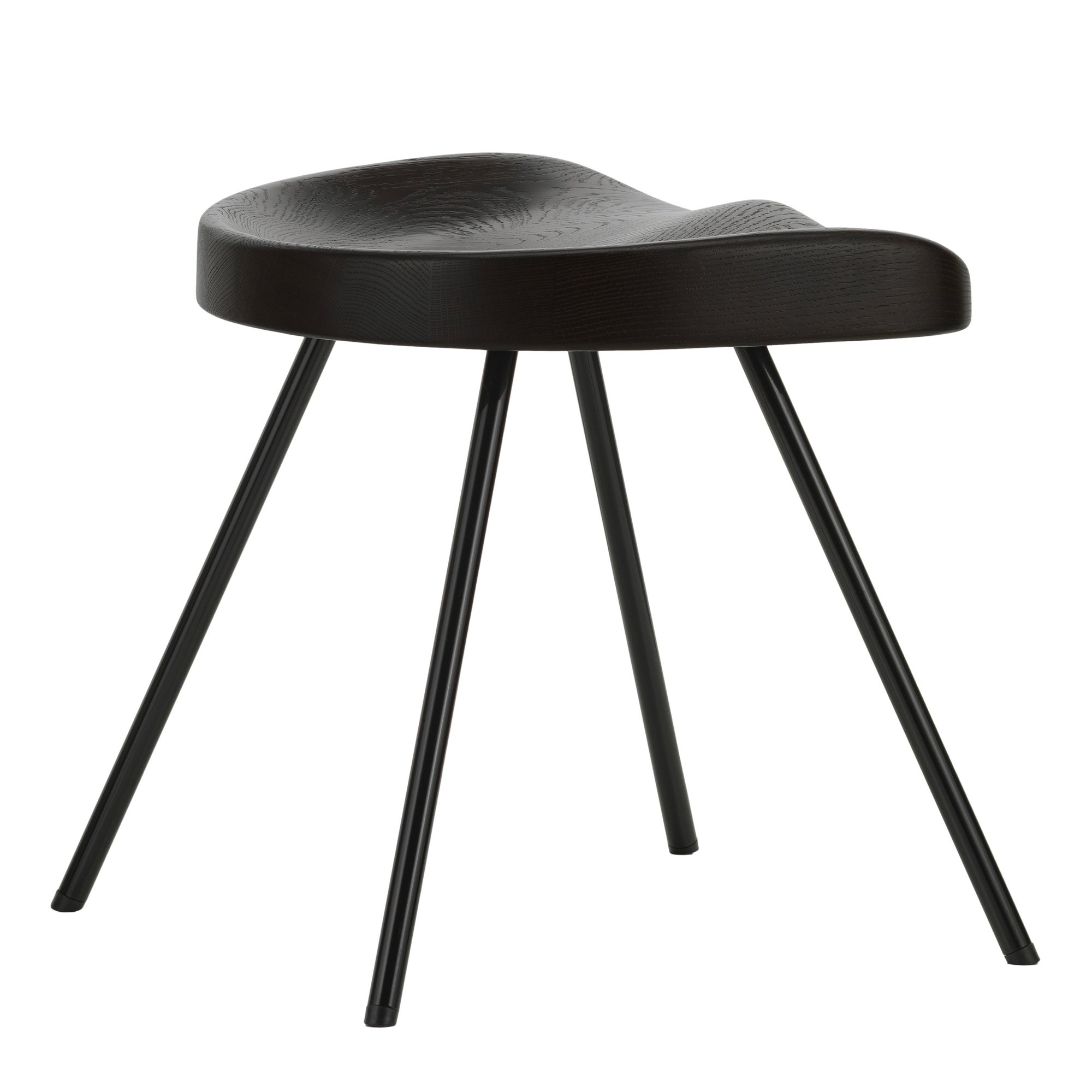 Der Tabouret N° 307 ist in zwei Versionen erhältlich: Mit Sitz in heller Eiche und Untergestell in Prouvé Colombe oder mit Sitz in dunkler Eiche und Untergestell in tiefschwarz