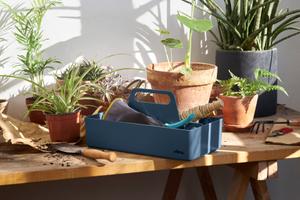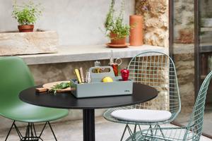 Die Toolbox ist ein Organisationswerkzeug für alle Formen von Arbeitsmaterialien oder Accessoires. Basis für das hochwertige Recyclingmaterial ist die haushaltnahe Wertstoffsammlung, vor allem gebrauchte Verpackungen. Das dunkle Grau der Toolbox RE ist die natürliche Farbe des verarbeiteten Recyclingwerkstoffs und weist darum kleinste Farbunregelmäßigkeiten auf.