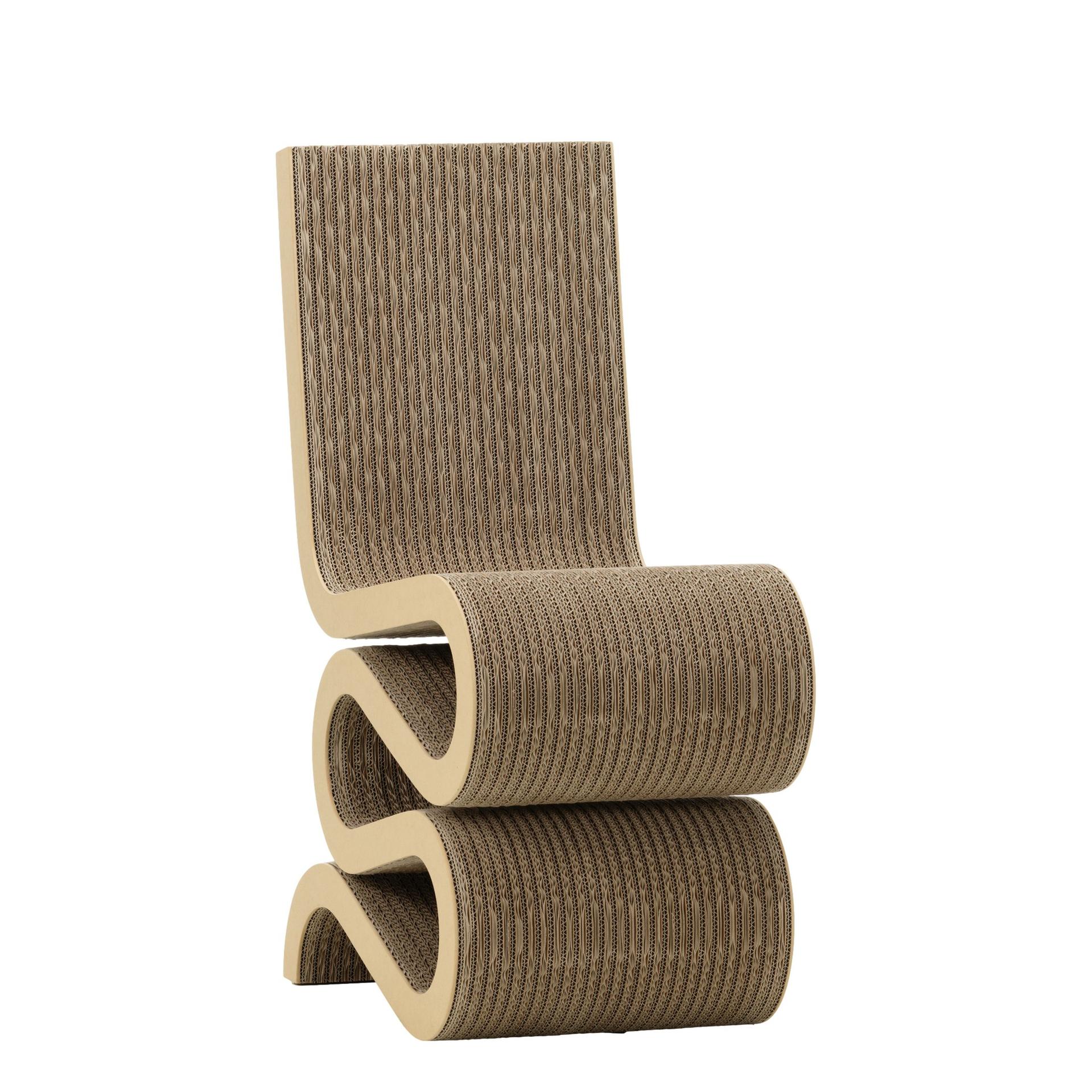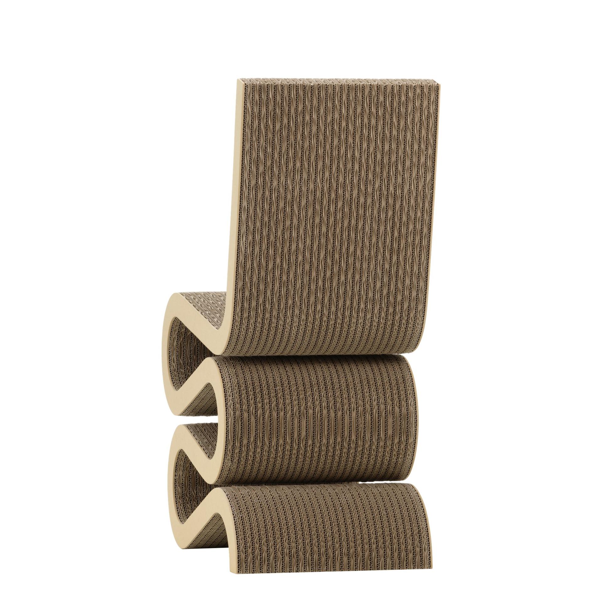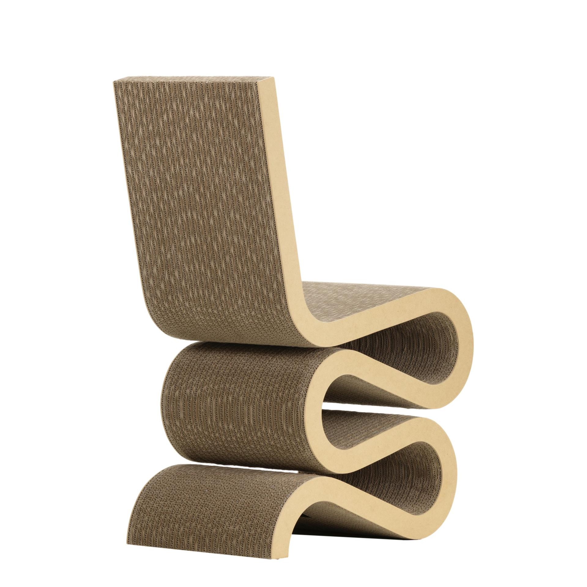 Der Wiggle Side Chair besticht durch seine ungewöhnliche Formgebung, die ihn wie ein Kunstwerk erscheinen lässt. Trotz seiner Einfachheit ist er durchdacht konstruiert und bietet eine überraschende Robustheit und Stabilität. Gehry, der 1929 in Toronto geboren wurde, erlangte weltweite Anerkennung für seine architektonischen Meisterwerke und seine Vorliebe für unkonventionelle Materialien. Die Easy Edges-Kollektion, die er zwischen 1969 und 1972 entwarf, zeigt seine besondere Fähigkeit, selbst Karton in Designklassiker zu verwandeln.