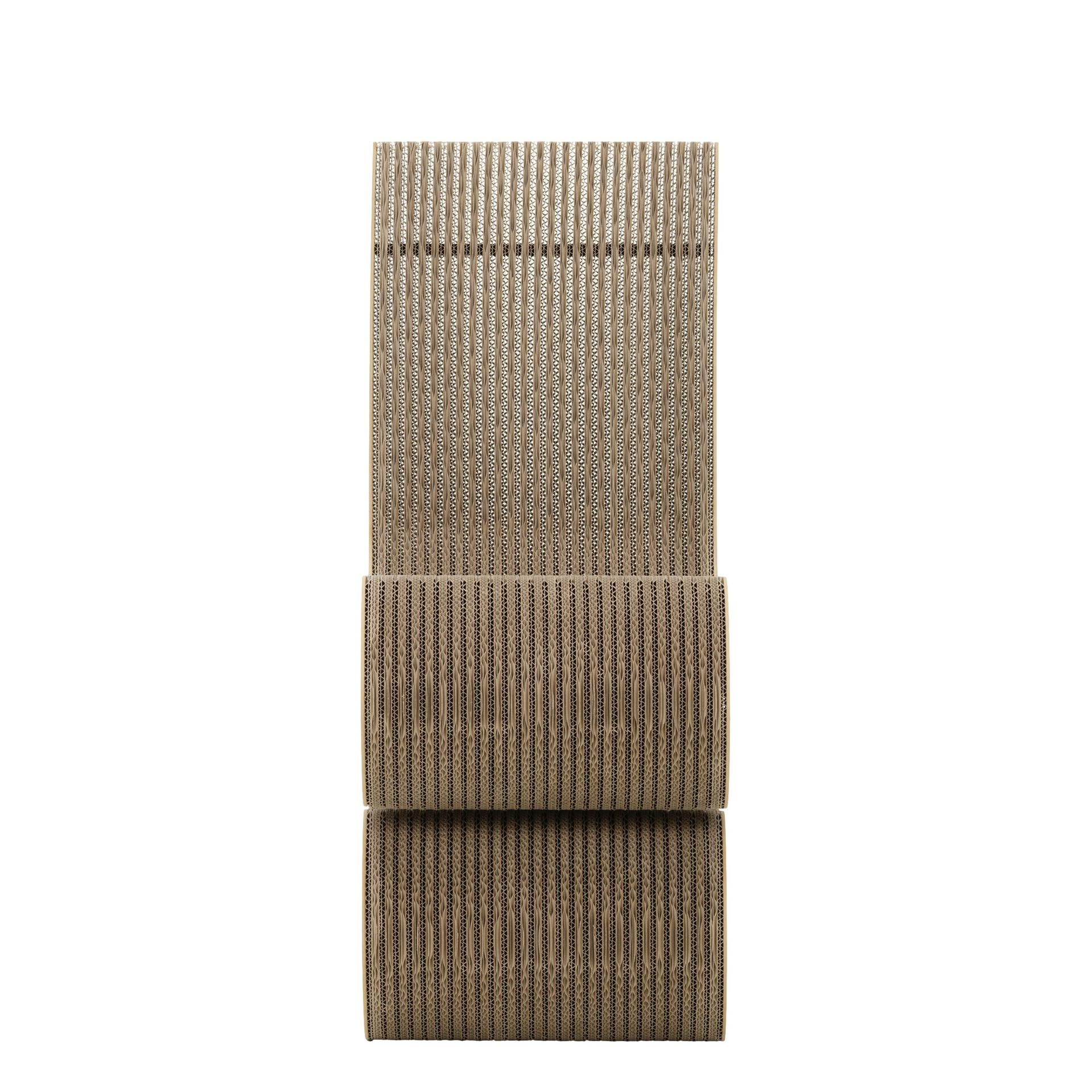Die Möbelserie „Easy Edges“ von Frank Gehry, zu der auch der Wiggle Side Chair gehört, zeigt eindrucksvoll, wie ein alltägliches Material wie Karton eine völlig neue ästhetische Dimension erhalten kann. Der von Vitra produzierte Wiggle Side Chair überzeugt durch seine skulpturale Form, die sowohl Sitzkomfort als auch Stabilität bietet. Gehry, bekannt für seine innovative Materialwahl, hat es mit diesem Entwurf geschafft, Karton in ein außergewöhnliches Designobjekt zu verwandeln.