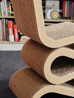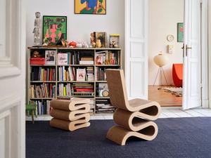 Der Wiggle Stool, entworfen von Frank Gehry und Teil seiner berühmten „Easy Edges“-Serie, zeigt, wie kreativ der Architekt mit alltäglichen Materialien wie Karton umgeht. Der von Vitra produzierte Hocker beeindruckt durch seine skulpturale Form und bietet trotz der scheinbaren Schlichtheit eine bemerkenswerte Stabilität und Funktionalität. Gehry, der für seine experimentelle Herangehensweise bekannt ist, verlieh dem einfachen Karton eine neue, ästhetische Qualität.