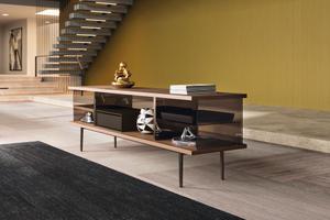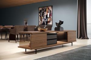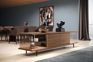 Die The Farns Sideboard Serie basiert auf den Entwürfen von Ludwig Mies van der Rohes berühmten "Farnsworth House". Zeitlose Architektur spielt mit Licht und Schatten, Holz und Glas.