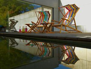 Der Cabin Liegestuhl Deluxe erinnert in Form und Farbe an klassische Strandmöbel und bietet höchsten Komfort.