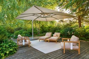Der Schirm wird standardmäßig inkl. Flaschenzug und Bodenplatte, ohne Knickmechanismus konfiguriert.