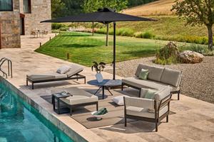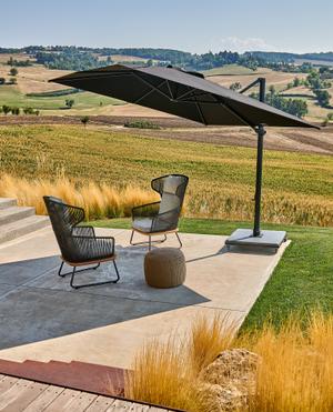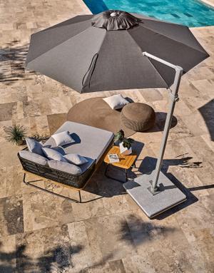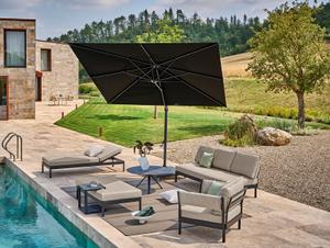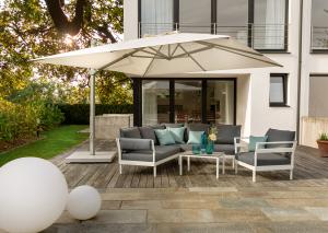 Der Weishäupl Sonnenschirme Freiarm zeichnet sich durch erstklassiges Material und sorgfältige Verarbeitung aus. Hergestellt aus pulverbeschichtetem Aluminium in grau, passen sie sich jeder Umgebung harmonisch an. Die Kombination dieser Materialien gewährleistet Stabilität und Witterungsbeständigkeit. Der Schirm wird mit einer Lufthaube und einem Flaschenzug geliefert und kann optional mit Volants ausgestattet werden.