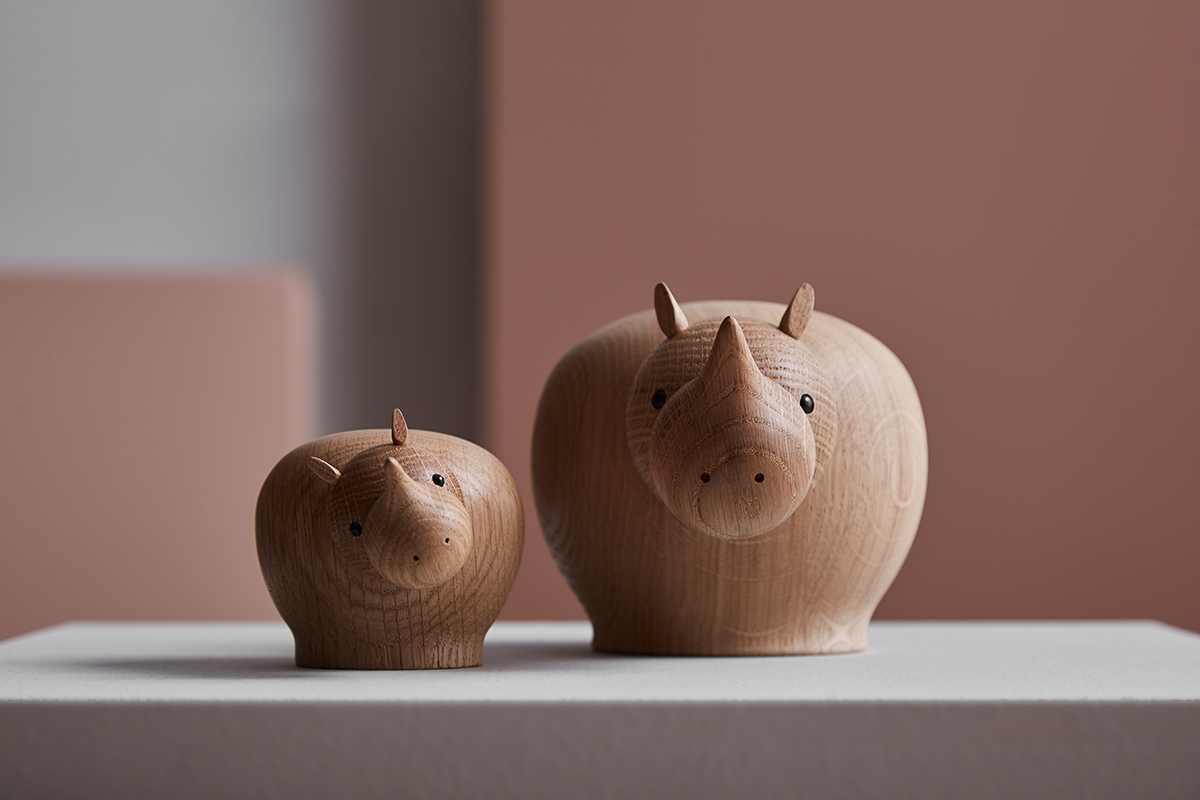 Rina baut auf einer alten Tradition dänischer Designer und Architekten ausdrucksstarke Holzskulpturen zu erschaffen. Ein schönes Detail: Der Ausdruck des Nashorns Rina lässt durch Drehen des Kopfes verändern, da er nach beiden Seiten gekippt werden kann.