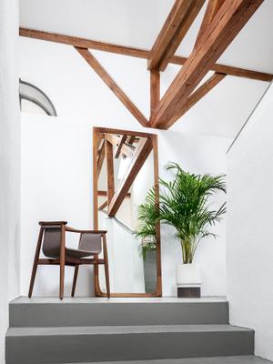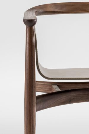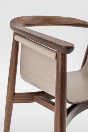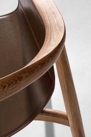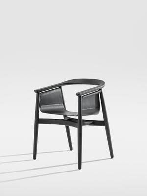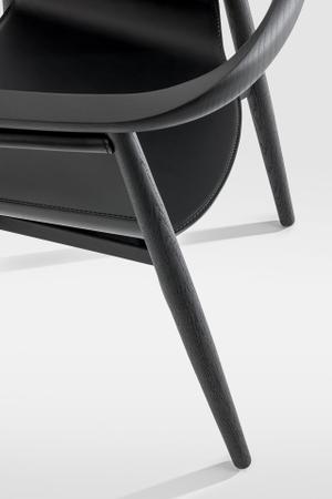 Mit Pelle hat das Designstudio Lorenz+Kaz 2012 einen Stuhl entworfen, der Eleganz mit klarer Funktion verbindet. Sein halbkreisförmiges Rücken- und Armlehnen-Element erinnert an skandinavische Klassiker und verleiht dem Entwurf eine großzügige, offene Anmutung. Charakteristisch ist der frei hängende Sitz, der von einer Rundstrebe getragen wird und so Leichtigkeit und Stabilität zugleich vermittelt. In der Leder-Ausführung entsteht eine besonders klare, grafische Wirkung mit feiner Materialität.